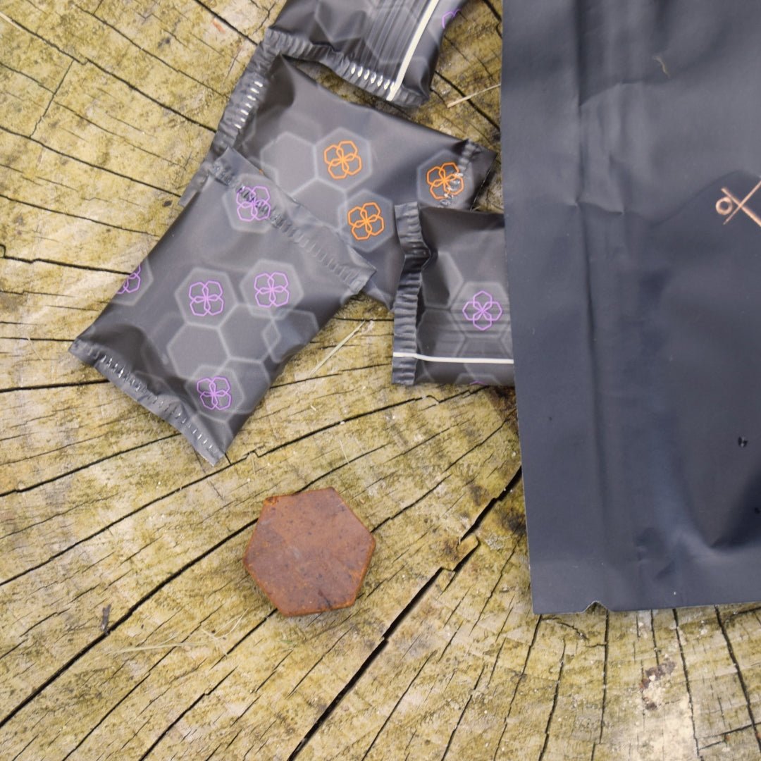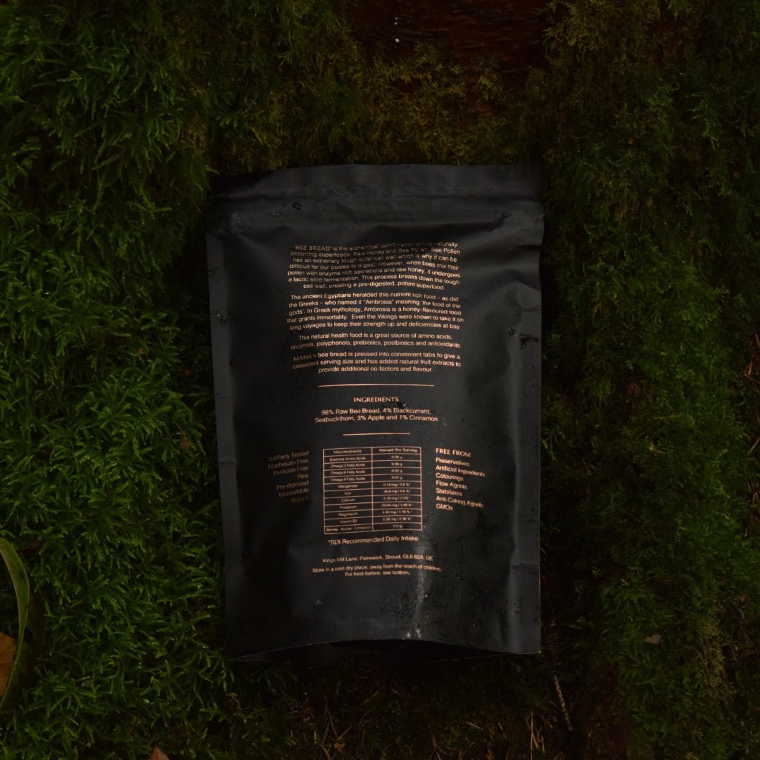 96% Raw, glyphosate and pesticide free Bee Bread. 4% fruit extracts (Blackcurrant / Seabuckthorn / Apple and Cinnamon)